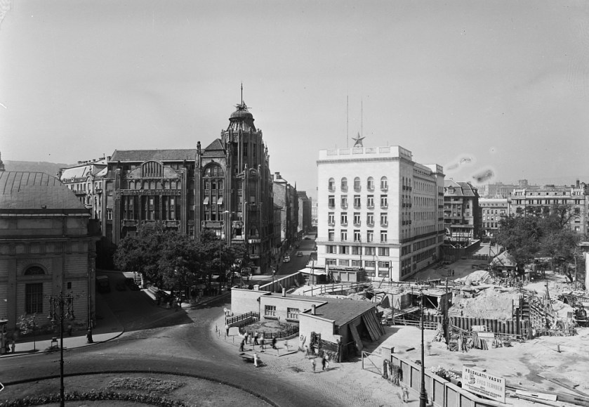 Egy évvel később a Modern–Breitner-ház saroktornya még mindig a helyén, a főkapitányság épülete előtt azonban már építkezés folyik, és felvonulási területté változott az egykori Adria-háztól nyugatra eső tömb telke is. A metróépítkezés egyébként majdhogynem a végzete lett az egykori Adria-háznak, mert ahogy Prakfalvi Endre írja a budapesti ős-metróról szóló tanulmányában, a metró Sztálin téri állomását az egész metróépítkezés fő akcentusának, egy világvárosi városközpont kialakítása esélyének tekintette a felsőbb vezetés, és a tervötletek között olyan is akadt, amely a készülő metró utcaszinti kijáratát magába az épületbe vezette volna, úgy, hogy a Tőry–Pogány-féle kinézetét kívülről alapvetően még mindig őrző építményt teljesen átalakították volna. Könnyen elképzelhető, hogy az autóbuszpályaudvar is ennek a tervnek a jegyében került ide, egy városi park addig szigorúan zöldfelületként létező szegletébe, Budapest távolsági közlekedési kapcsolatai közül (természetesen még egy egészen más dinamikájú, szerkezetű és sűrűségű tömegközlekedés keretében, mint ma) egyedüli végállomásként a kiskörúti övezeten belülre. A metró ötvenes évekbeli elképzelései azonban (bár a földfelszín alatt sok minden megvalósult belőlük,