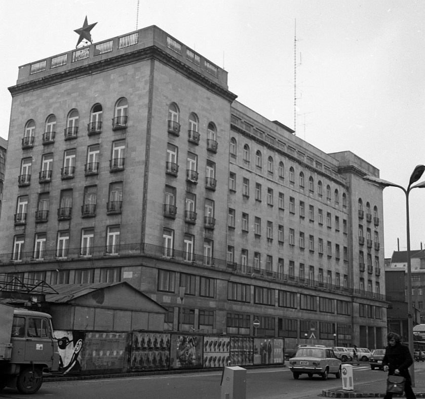 De ezek már a békeévek. Háttérben ott a viszonylag rövid idő alatt rendbehozott, belülről teljesen átalakított épület, és mintha legfontosabb, elkövetkező negyven évét, a békeéveket meghatározó, a lentebbi képeken majd szembetűnő attribútuma, a hatalmas ötágú vörös csillag még nem lenne a helyén. A kép (azon kívül, ha az olvasó a Fortepanon rendesen kinagyítja a képet, itt is látszik az északi homlokzat jobb alsó sarkára állított, még ott lévő szobor) különös építészettörténeti paradoxont is rejt. Az Adria-ház már új feladatára szóló belső áttervezését ugyanis az a Lauber László végezte, aki a háború előtti időszakban tandemben dolgozott Nyiri Istvánnal, és párosban fiatalon (mindketten 1902-ben születtek, és egyikük sem érte meg a magyar sztálinizmus végét, Lauber 1953-ban, Nyiri 1955-ben halt meg), a háború előtti évtizedben a magyar építészeti modernizmus legjelesebb képviselői közé számítottak. Sok épület kötődik a nevükhöz közös munkaként, itt most a talán legmonumentálisabbat, a Szabadság tér déli részén álló, 1937-ben tervezett, 1938 és 1940 között emelt Pénzintézeti Központot mutatom meg