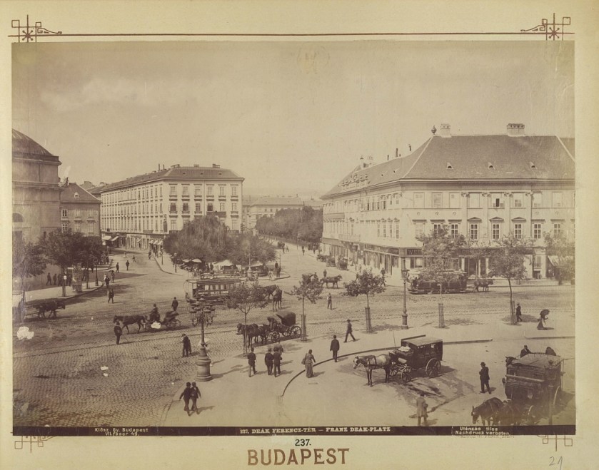 A Deák téren készült felvétel a károkat a keleti oldal felől mutatja (az orosz egyenruhába öltözött felszabadítók, nem kell nagy jóstehetség hozzá, aligha fogják már mozgásra bírni ezt a járművet, bár szándékuk talán nem is kifejezetten ez), a háttérben elszenesedett, füstkormos nyílászárók, de a kép jobb sarkán kis képzelőerővel kivehető, hogy a keleti homlokzat jobb alsó szélén elhelyezett szobor még a helyén van, ám hogy ép vagy csonka a figura, innen nem állapítható meg (Budapest ostromakor a visszavonuló vesztesek robbantani szerettek, globálisan, az előretörő győztesek viszont szívesen szórakoztak, lokálisan, az esetleg még épségben eléjük kerülő kőszobrok szétlövésével).