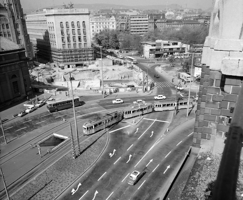Az élet viszont mégsem állt meg. Ez a kép ugyan kilenc évvel a születésem előtt készült, már a gyerekkorom idejébe vezet. A Deák téri Általános Iskola tanulójaként a hetvenes évekből erre a látványra emlékszem legjobban, a KÉV-Metró felvonulási területére, fúrótornyokkal, darukkal, a Bécsi utca felé magasabb üzemi épülettel, a kapun ki-bejáró dömperekkel, betonkeverő kocsikkal, az én időmben a kerítésen inkább már színes plakátokkal — minket ugyanis iskolaidőben vagy napköziben leggyakrabban az Engels tér déli szélére eső mókuskerekes, rakéta- és gömbmászókás, kavicsos játszótérre vittek ki,