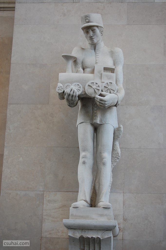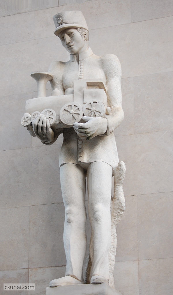 és ennél a szobornál hívom fel a figyelmet a különféle darabok összjátékára, együttesére, továbbá arra a tényre is, amit saját képpel sajnos nem tudok igazolni, de a Köztérkép egyik műlapjával, a Csertőn felállított Fiú mozdonnyal című 1970-es Rétfalvi-szoborral igen, hogy az a jelleg, karakter és zsáner, amit ez a tíz szobor itt egységesen képvisel, az ornamentális munkáiban igen gyakorlott szobrász pályáján már három évtizeddel korábban artikulálódott egy önálló köztéri szobrában.