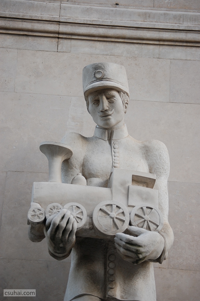 kezében gőzmozdonyt tartó férfiban könnyű felismerni a vasutast,