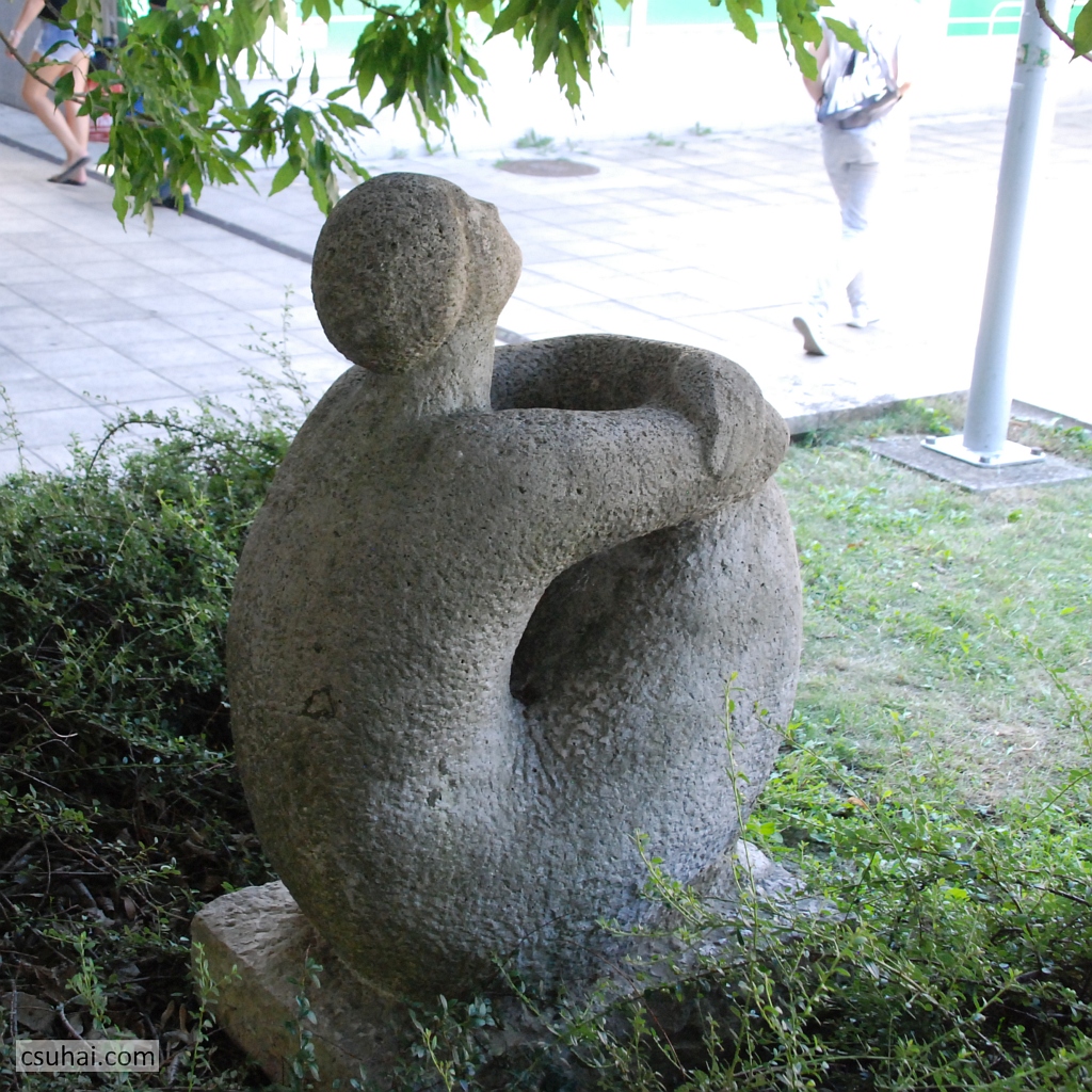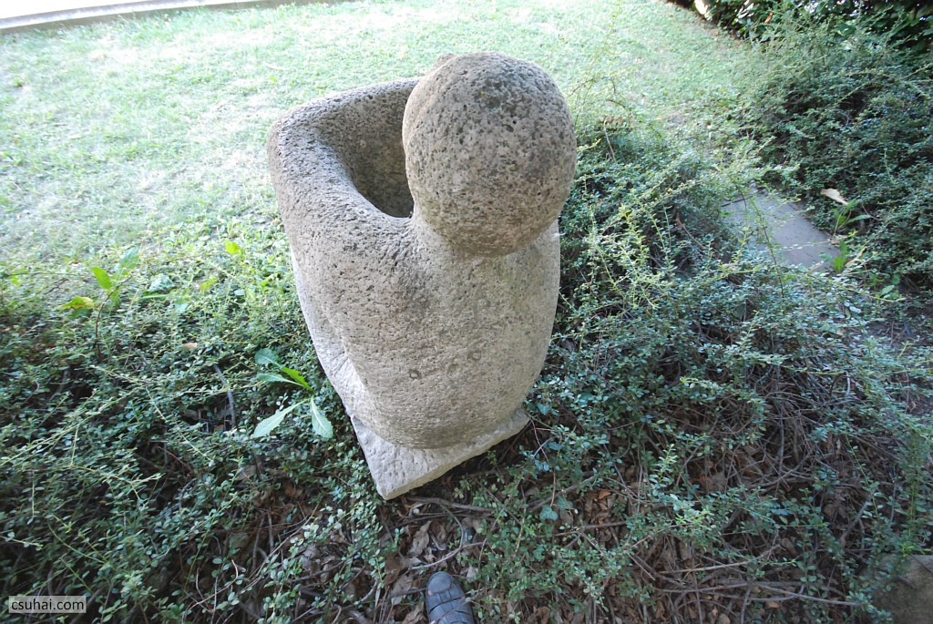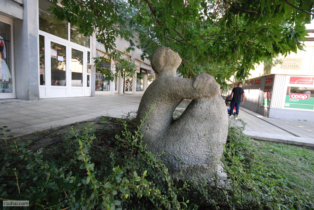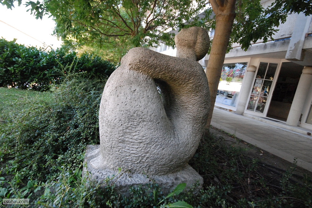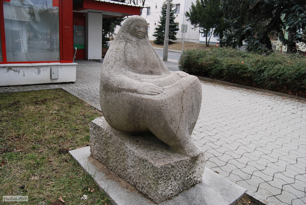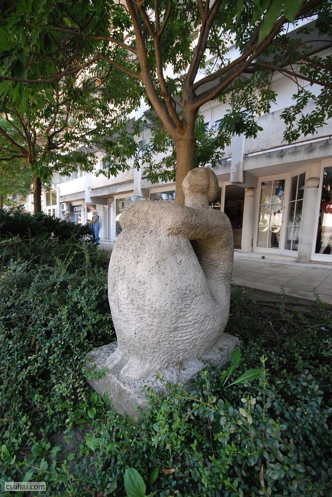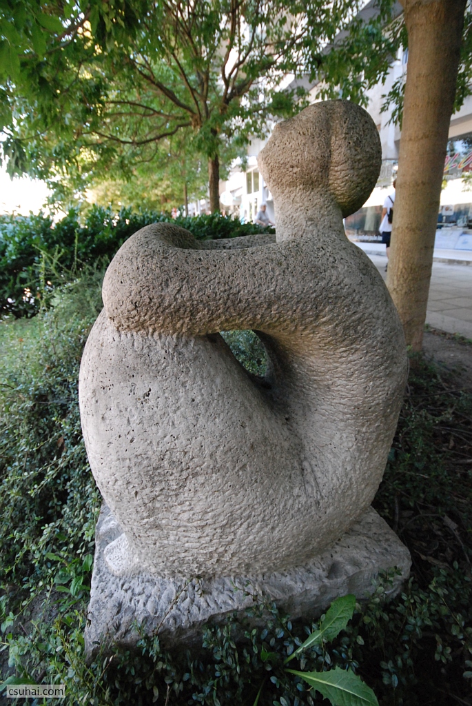 és az egytömbűség meg a domináló gömbalak eszembe juttatta ugyanő veszprémi Halaskofáját (mindkettő pár évvel korábbi darab, a Halaskofa már 1963-ban készen állt, de az idejét raktárban múlatta, mire az otthonául szolgáló lakótelep 1967-re felépült), olyannyira, hogy elkezdtem Lesenyei Márta, illetve Rózsa Péter pályájának adatait böngészni, azok hátha kiderítenek valamilyen a háttérben megbúvó közös ihlető forrást vagy mestert. Rózsa Péter két évvel korábban született ugyan, mint Lesenyei Márta, főiskolai tanulmányait azonban az után kezdte, hogy kollégája már befejezte őket (1955-ben), és egyetlen közös mesterükre akadtam, Pátzay Pálra, akitől viszont ez a fajta formálásmód távolabb állt (más lett volna a helyzet, ha a közös mester például Borsos Miklós, akinek az “egyetlen kő” elgondolása már itt a blogon is többször szóba hozott, az ő egész szobrászati pályáját definiáló tényező volt). Úgyhogy a hasonlóság pusztán a lelkes és laikus szobornéző véletlen találata, amit leginkább az anyag vezérel,
