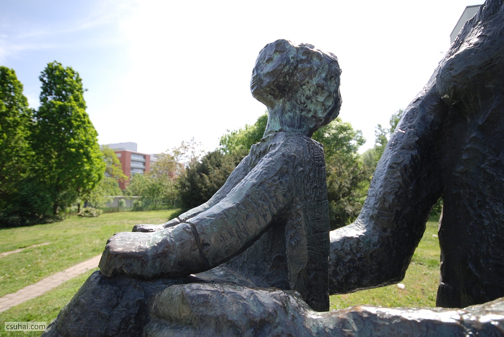 mutatóba maradt meg közülük véletlenül néhány darab, és mivel ez a szoborcsoport eredetileg az egész blog kiváltó eszméje, elindító gondolata volt, nekem egyik legkedvesebb szobrom, arra gondolok, ha majd egyszer újra a medencébe ereszkedem, és újra lefényképezem ezt a hat csodás figurát, az a blog befejezését is fogja jelenteni, úgyhogy egyelőre tartózkodom az ismétléstől. De sok más szobor mellett e bejegyzés közvetlen tárgyához, az Irinyi József utcai Kerényi-szoborhoz is Natáliával mentünk 2014 májusában, másodszori próbálkozásra, előszörre egy-két héttel korábban Újbudát keresztül-kasul bejárva egyszerűen képtelenek voltunk megtalálni. Ebbe belejátszott, hogy a különben másodpéldány szobrot (első változata 1971 óta a távoli Moszkvában, a magyar nagykövetségen áll,
