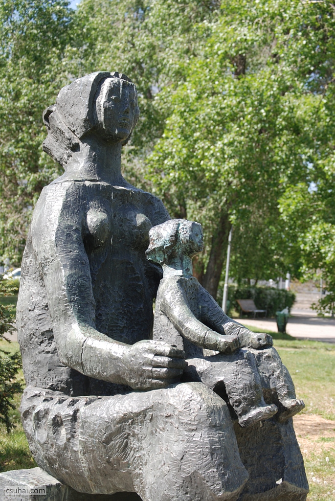 Ennek a szobornak az első fényképezése arra az időszakra esett, amikor a blogom elkezdett megállapodni, és a nyitó expanzió után átlépett a szisztematikus gyűjtés szakaszába. Kerényi Jenő (1908–1975) a szocmodern magyar szobrászat időszakának, az 1950-es évek legvégétől az 1980-as évekig tartó szakasznak abszolút kulcsszereplője. Nem csoda tehát, bárhol jártam, első dolgaim közé tartozott a településen felállított Kerényi-szobrot megkeresni. A blog figyelmes olvasói emlékezhetnek rá, mert akkoriban beszámoltam róla, hogy megtörtént, előzetes tájékozódás sem kellett a körbefényképezéshez: Karcagon például egy járó motorú, az utolsó komp indulása által sürgetett jó gépkocsiból ugrottam ki, hogy ezt az Anya gyermekkel-t valamivel több mint egy perc leforgása alatt gyorsan megörökítsem —