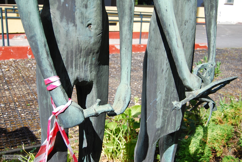 a nő nyilvánvalóan baromfit, a férfi valamilyen növény szárát, de 2017 őszén ennek megvitatását feladtam, úgy éreztem, értelmes, tiszta szoborrészletben úgysem tudtam volna megmutatni. Fel is háborodtam rajta, hogy egy köztéri műalkotást erre használnak, az útterelő szalagot kötik ki hozzá. Eltelt több mint öt év, a képeket elfelejtettem, csak az incidensre emlékeztem, és valami egész mást kerestem az akkori nagykanizsai képeim között, amikor erre a képre rápillantva hirtelen beugrott: hiszen a piros-fehér műanyag útterelő szalag a magyar oktatás legnemesebb, legvagányabb és legkitartóbb szabadságharcának, a Színház és Filmművészeti Egyetem a kormányalapítványosítás elleni küzdelmének lett a tökéletesen magától értetődő szimbóluma! És ahogy ez eszembe jutott, és a különleges jelentésváltozáson így átesett, ha nem is a szobor, de a róla készült néhány kép, azonnal felmagasztosult a félretolt felvételsorozat,