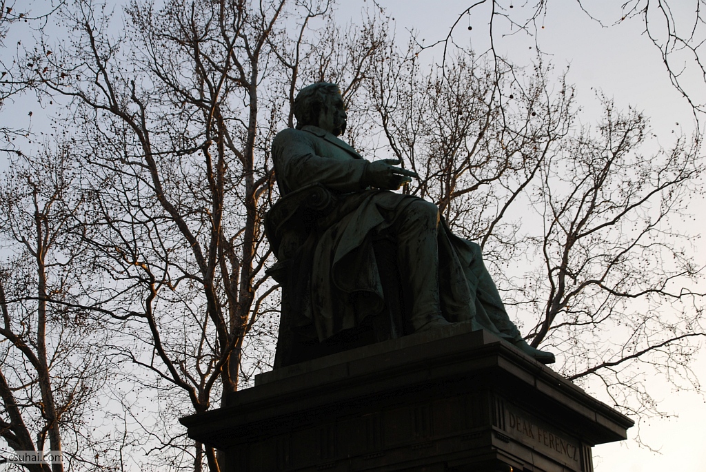 mindenesetre elégedett lehet helyzetével, amit magyaráz rendhagyóan hatalmas tömege (az ülő főalakos szobor 4.70 méter magas, a vele szemben lévő álló Széchenyi kisebb, 4 és fél méter).