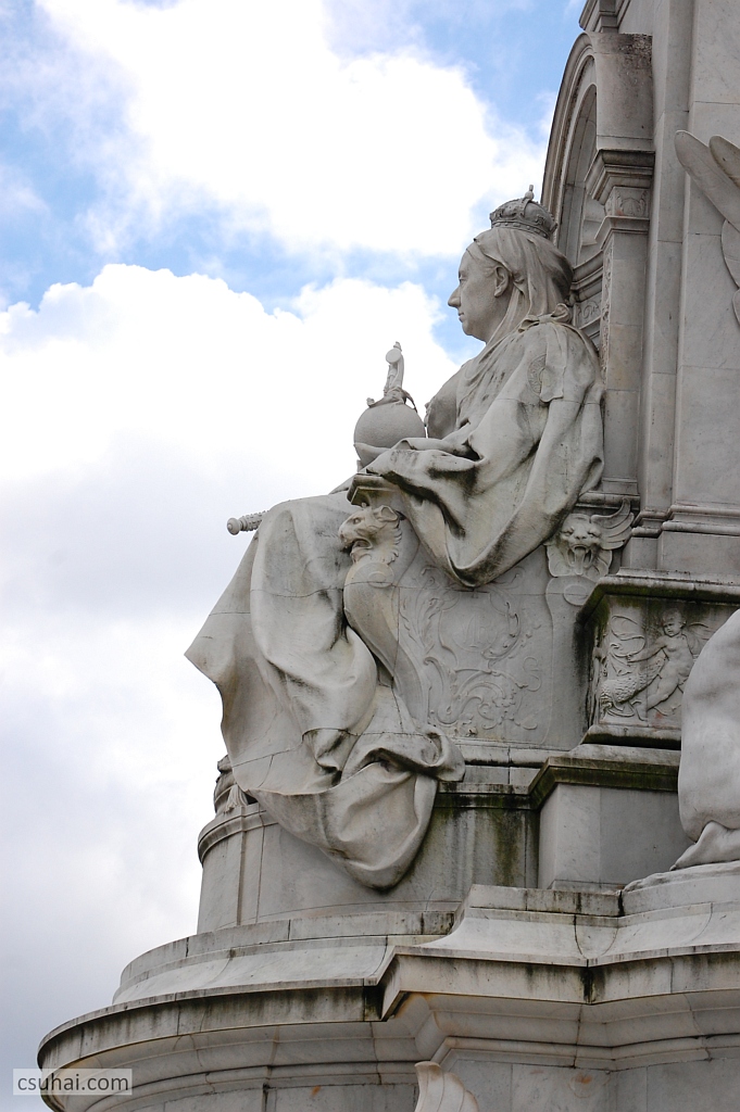 ő igen szerényen nem is saját Buckingham Palota előtti emlékművének csúcsán, hiszen ott egy ebben a kontextusban lefordíthatatlan szójáték,