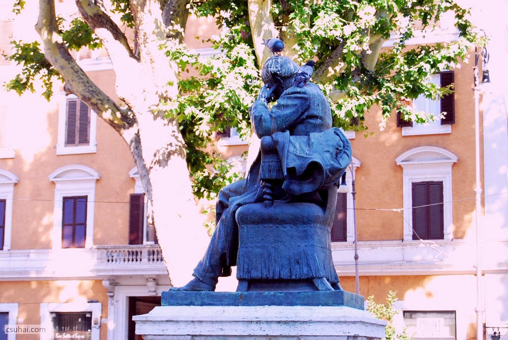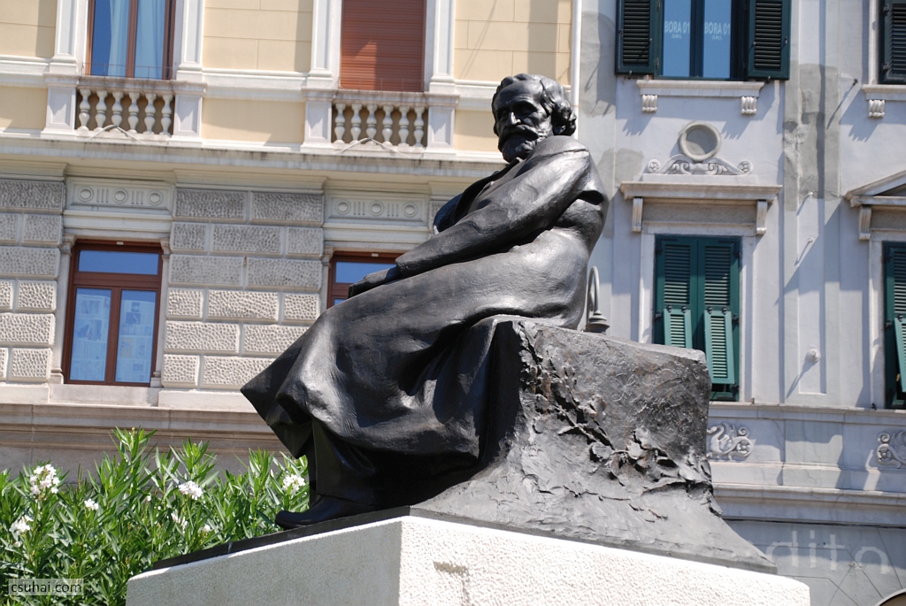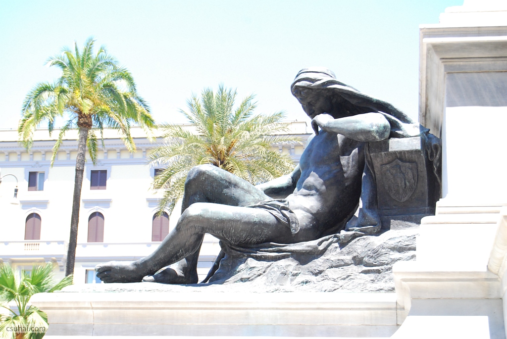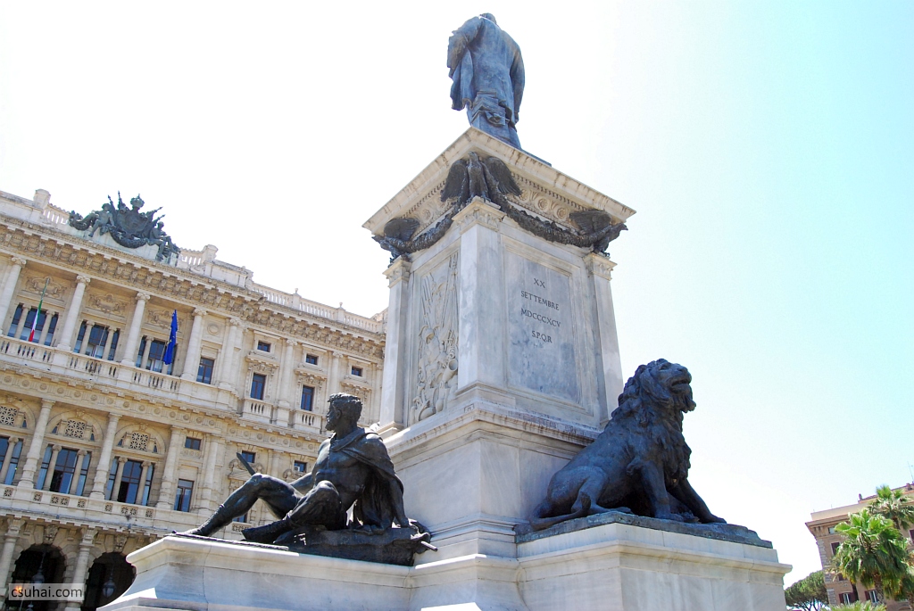 nem beszélve a piedesztál hátsó részén ücsörgő oroszlánról — de hát ismétlem, ülő oroszlánnal Teverét lehet rekeszteni. (Cavour római szobránál harminc évvel korábbi milánói ábrázolásáról itt lehet olvasni.)