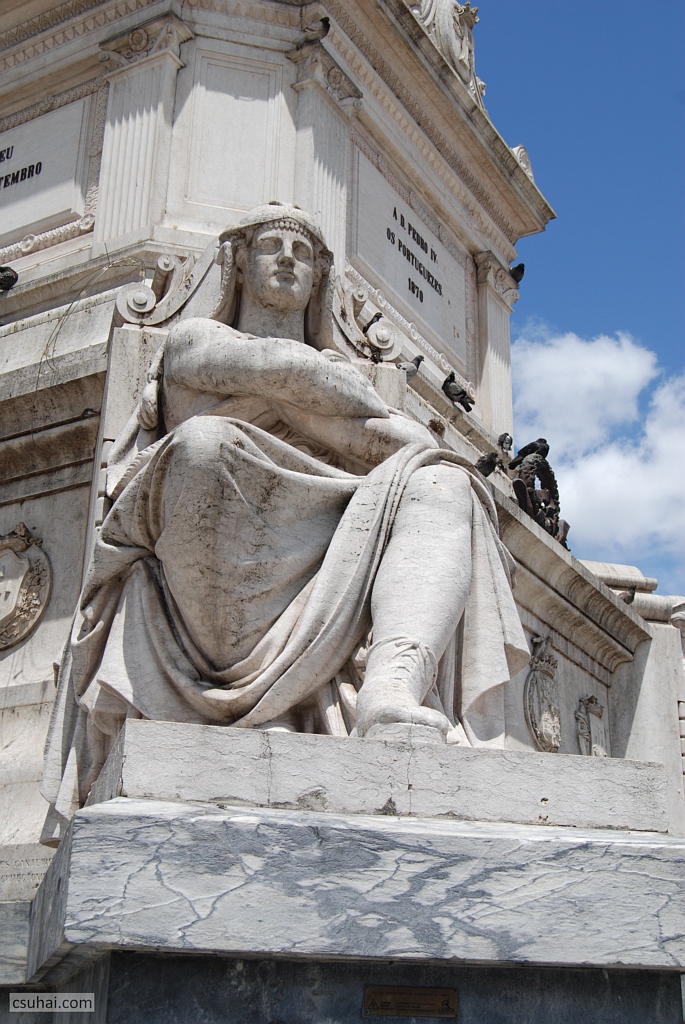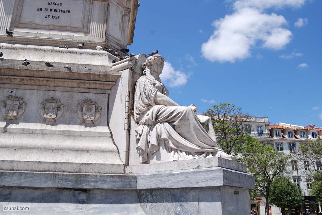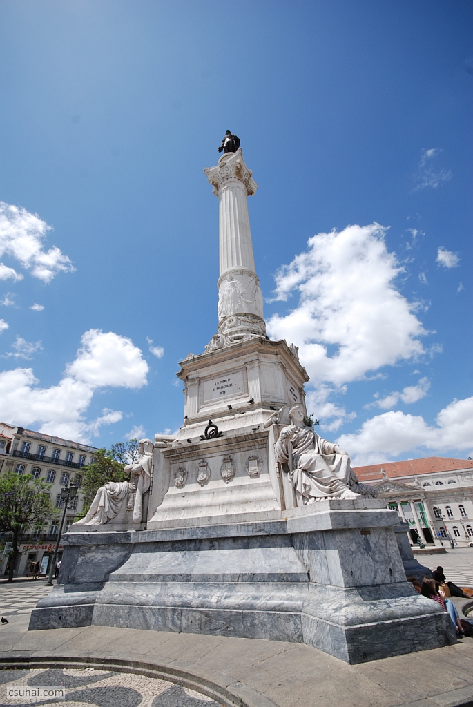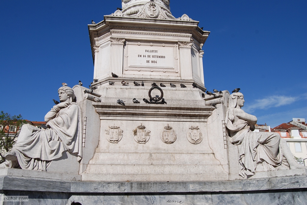 (maga a főalak, a 23 méter magas korinthoszi rendű oszlopon álló IV. Péter portugál király, e minőségében csak néhány hónapig ült a trónon, igaz uralkodása alatt elfogadtak egy alkotmányt, Brazíliának I. Péter néven viszont hosszasan volt az első császára, a dimbes-dombos Lisszabon valamelyik lépcsőjén leereszkedve látható a legjobb perspektívában)