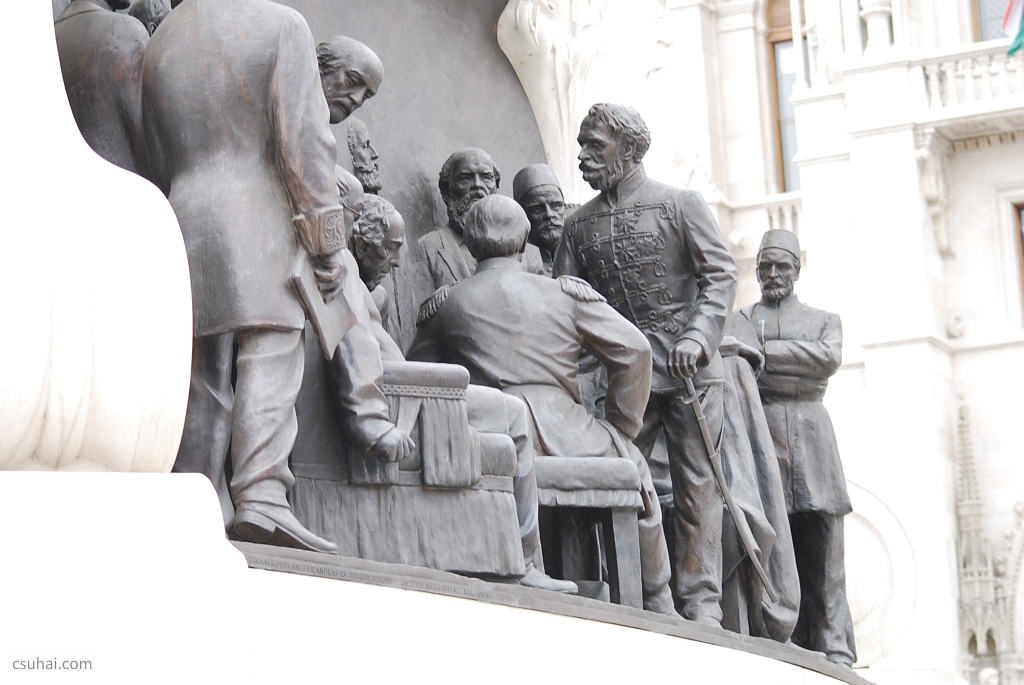 noha Andrássy Gyula külügyminiszteri minőségében épp feláll székéből a berlini kongresszus jelenetét ábrázoló másik, a város felőli domborművön lovasszobra talapzatán.