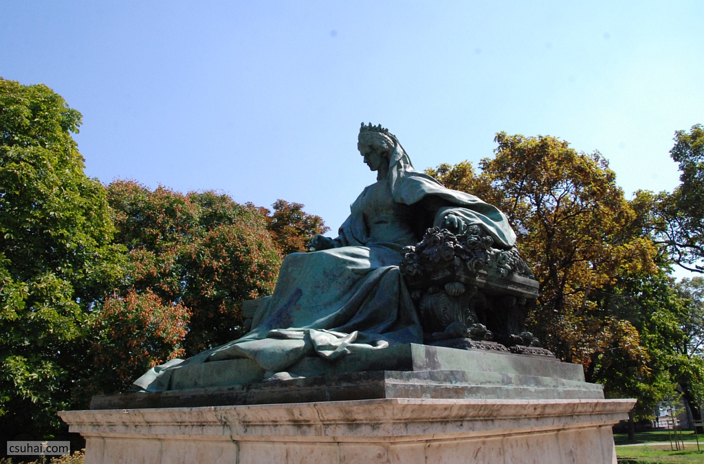 meg egy harmadik, az Andrássy-lovasszobor Duna felé eső domborművén, eredetileg Zala György kezemunkáján, amit a háború utáni beolvasztást követően rekonstruálva 2016 óta látunk, Deák Ferenc társaságában riadt megilletődöttséggel nézi férje magyar királlyá koronázását (“a haza bölcse” a valóságban jellegzetes magyar megoldást választott, a kiegyezés leginkább az ő érdeme volt, ennek része volt a perszonálunió is, személyes jelenlétével az itt ábrázoltakkal ellentétben végül mégsem tisztelte meg az ünnepséget).