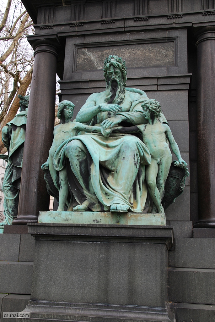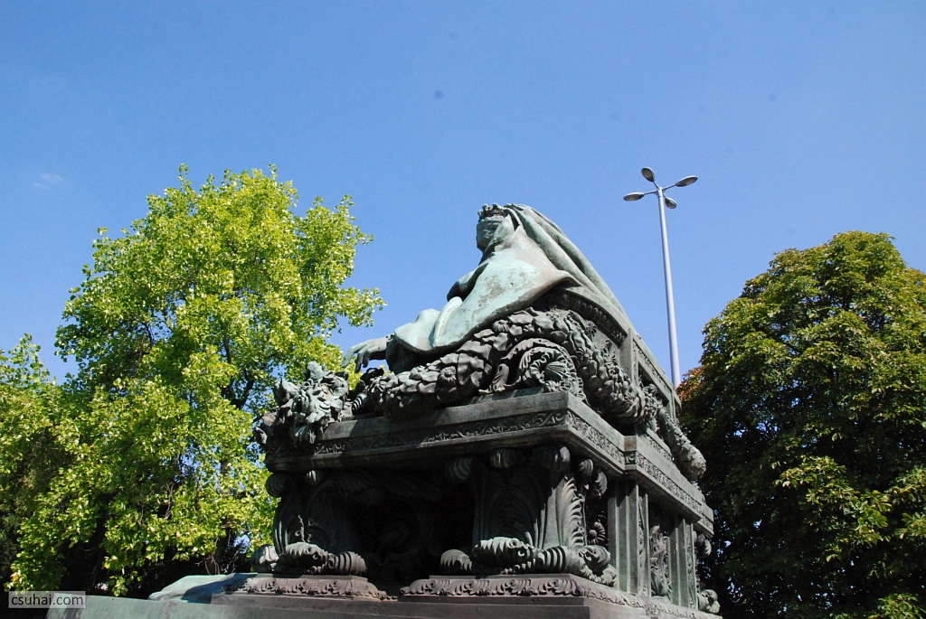 de jól láthatóan allegóriákká átalakult ülő udvarhölgyeinek kíséretében (és ha az egész emlékművet tekintenénk, még további lovas hadfiakkal és álló államférfiakkal),