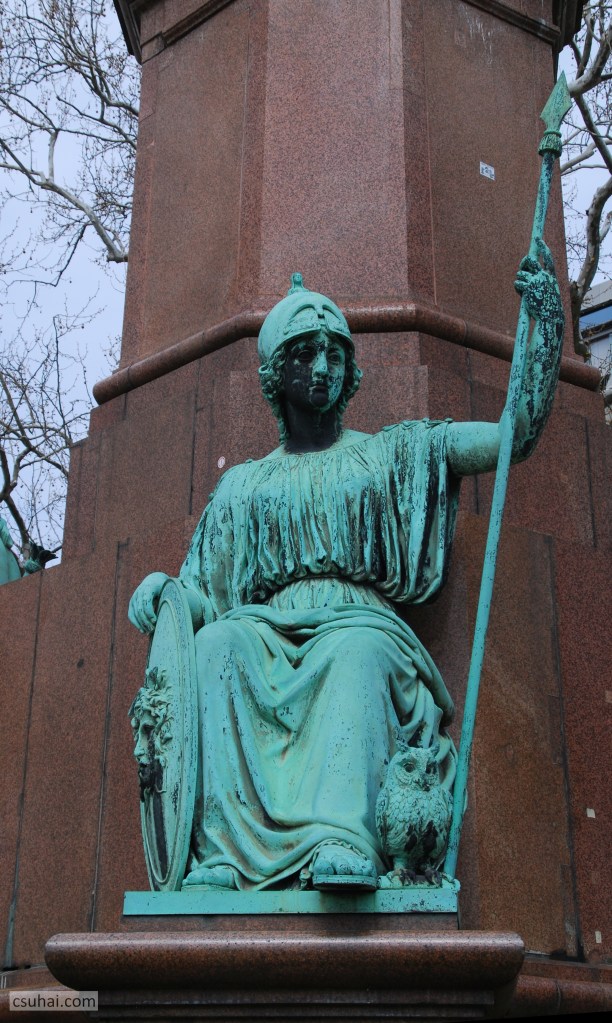 valamint baglyával Minerva, emlékeztetve Széchenyi a tudomány támogatásáért végbevitt nagyszerű cselekedeteire. Deák szobra