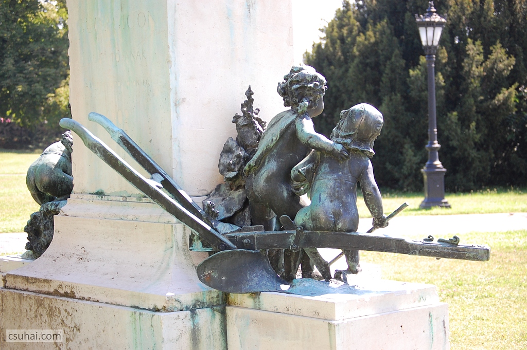 de a talapzat négy sarkára négy ülő figura, négy ókori istenség került — Ceres istennő, a földművelés megtestesítője,