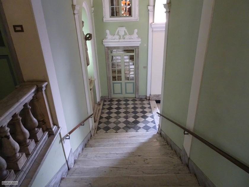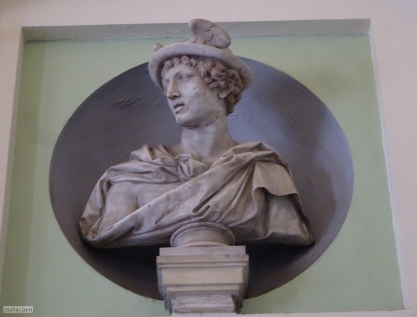 a lépcsőfordulóban egy mellszobrot, palástbüszt,