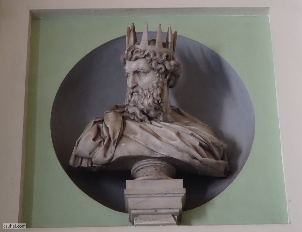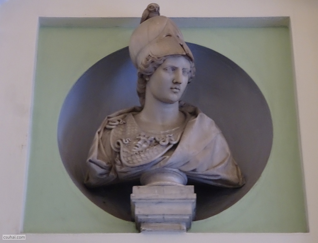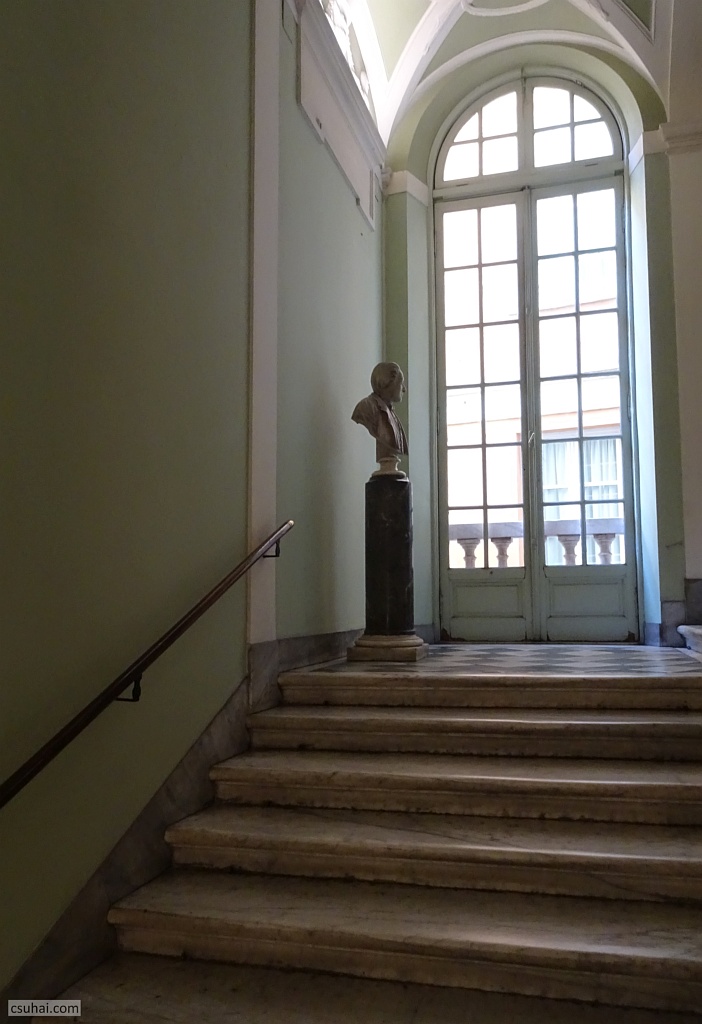 a lépcsőfordulóban egy mellszobrot, palástbüszt,