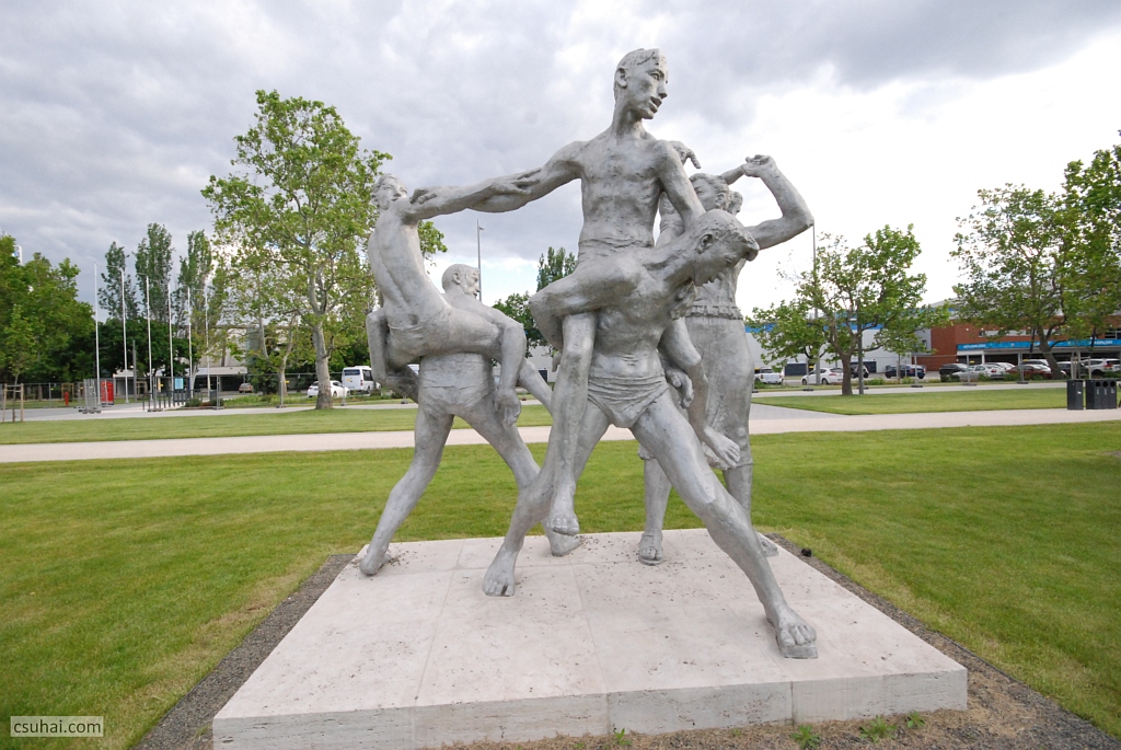 Az 1957-es szoborra könnyen rásüthetjük, hogy inkább heroikus, szocreál fogantatású szobor, és létrejöttének adatait tekintve ez talán igaz is — a szobrász az avatás előtt évekkel, az 50-es évek közepén fogott neki a megformálásnak. Somogyi József és a szocialista realizmus kapcsolata azonban meglehetősen ambivalens dolog. A Népstadion dromoszába az ötvenes évek második felében állított Lovacskázók című szobráról itt a blogon sokszor elmondtam már, hogy kiemelkedő, a másik tizenöt itt álló szoborhármastól eltérő kompozíció