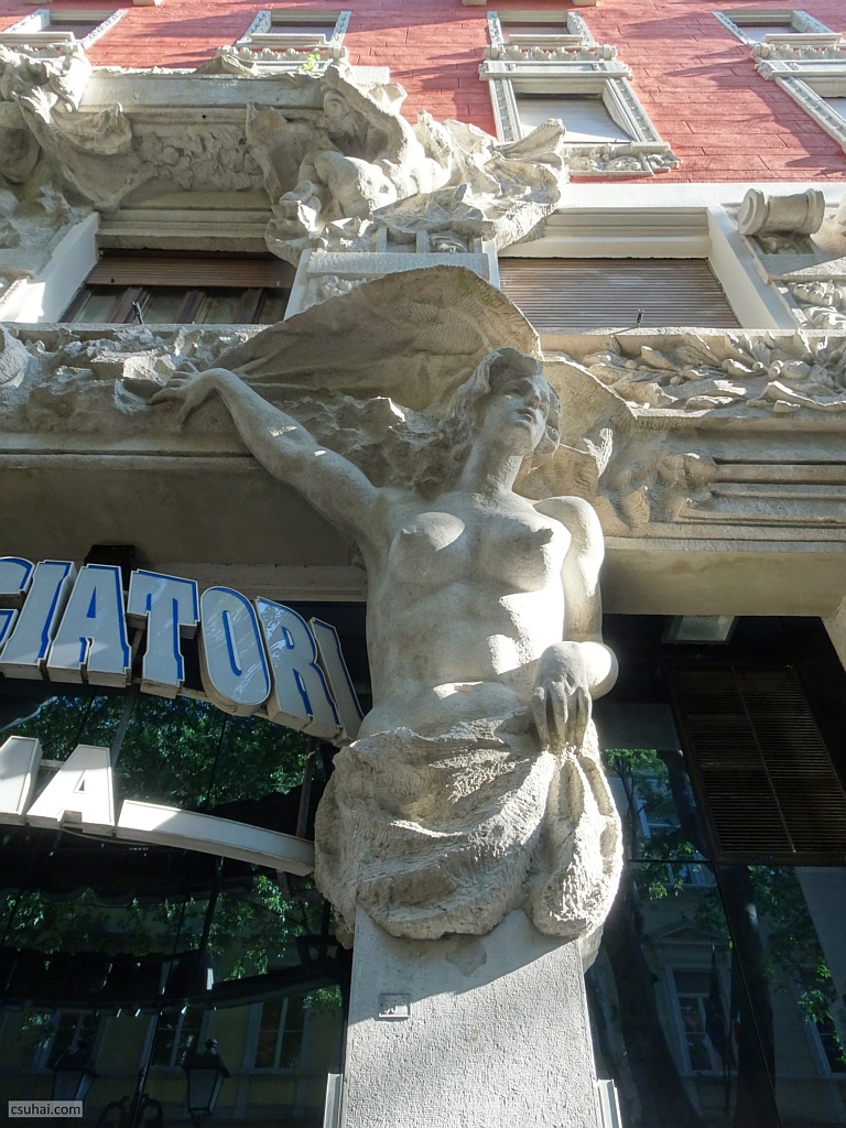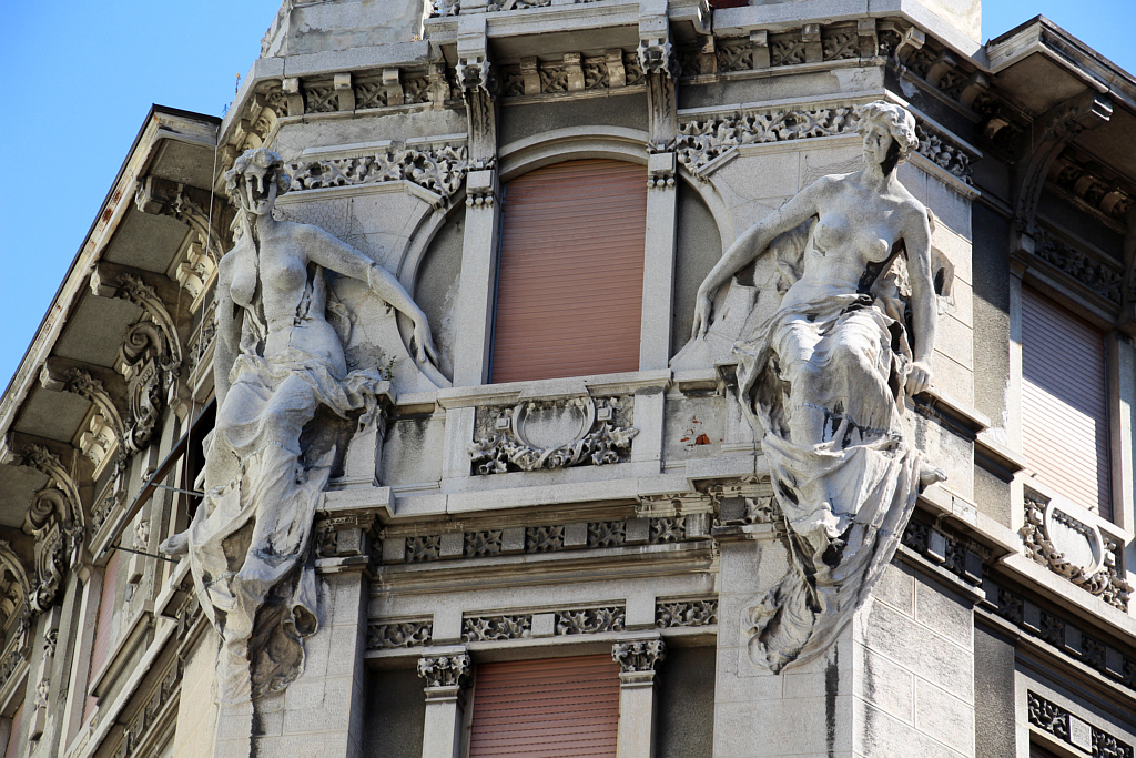ehhez semmi kétség nem fér, páros épületszobroktól szokatlan módon mind a ketten ugyanabba az irányba, a fejüket kissé balra fordítva néznek. Maga az épület, a Viviani-Giberti palota a Milánóban élő és Olaszország-szerte sokat tervező mester, az olasz Art Nouveau vagy Liberty-stílus egyik legjelentősebb képviselőjének tartott Giuseppe Sommaruga (1867–1917) irodájából kikerülő munka (ez az egyetlen trieszti tervezése), de a bejárati rész kialakításához a fentebb már kétszer is említett Romeo Depaolinak is volt köze, és — a blog szempontjából talán ez a leglényegesebb — történetesen mind a három itt bemutatott díszitőszobornak ugyanaz a szobrásza, a szintén trieszti illetőségű Romeo Rathmann (1880–1961). A húszas éveiben járó Rathmann a “belle epoque” befejező szakaszában nyilvánvalóan nagy kedvvel faragta ki ezeket a nem is annyira palástoltan erotikus kisugárzású női párosokat. Pályafutásának legtermékenyebb szakasza, a trieszti időszaka azonban az 1910-es évek végén véget ért, az egész régiót sújtó gazdasági nehézségek elől testvérével, a mintakészítő Antonióval Angliába költöztek, a nevüket Ratmanné változtatták, előbb a kensingtoni J. Whitehead and Son céghez szegődtek, 1931-ben aztán Ratman Brothers néven saját vállalkozást indítottak, ez viszont kérészéletűnek bizonyult, Antonio ugyanis 1932-ben váratlanul meghalt. Romeo az olasz fasizmus iránti lelkesedése biztosan nem szolgált pályafutása javára, valamikor a harmincas évek közepén, hiába élt még negyedszázadon át, félbetört. Ezt a trieszti épületet különben 1906–1907 során emelték, utcaszinti részét eredetileg színházként képzelték el, 1907 karácsonyán így is nyitotta meg kapuit, később lett belőle mozi, és a mai napig ekként működik. A bejárat két szélén álló két nőalakot a trieszti legenda szerint a városlakók gyorsan elnevezték